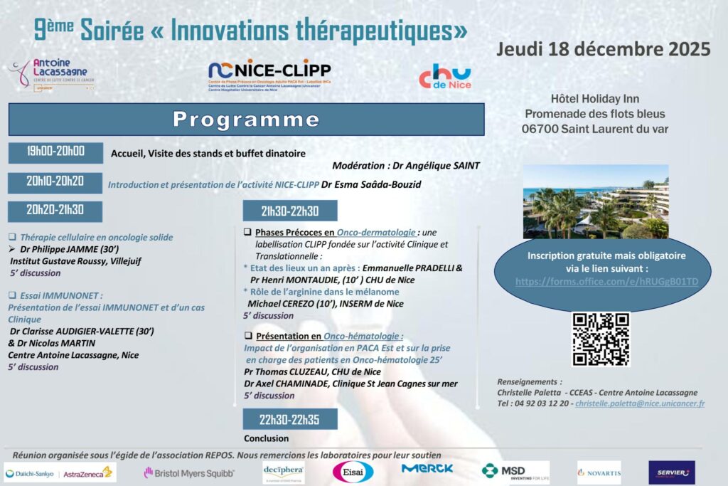 Organisée par le Centre Antoine-Lacassagne sous l’égide de l’association REPOS, le Nice-CLIPP ainsi que le CHU de Nice, cette 9ᵉ Soirée « Innovations Thérapeutiques » se tiendra le jeudi 18 décembre 2025 de 19h à 22h30 à l’Hôtel Holiday Inn de Saint-Laurent-du-Var.