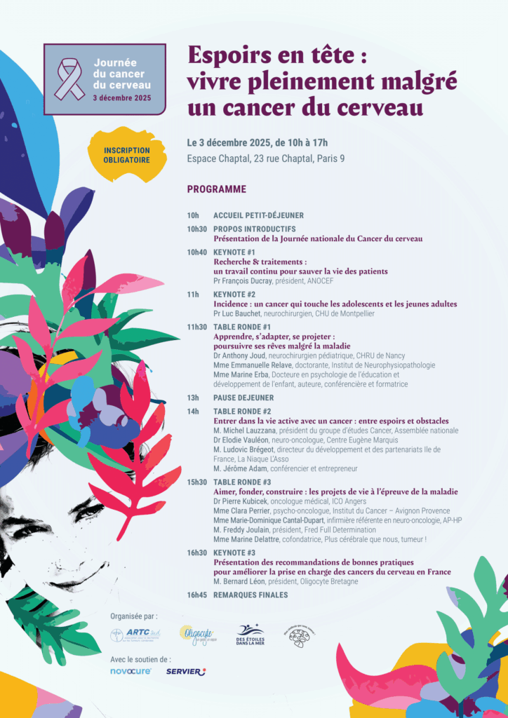 Pour la 3e édition de la Journée nationale du Cancer du Cerveau, 4 associations de patients dédiées aux personnes souffrant de cancers du cerveau : Association pour la Recherche sur les Tumeurs Cérébrales Sud, Oligocyte Bretagne, Des Étoiles Dans La Mer-Vaincre le Glioblastome, et Plus cérébrale que nous tumeur ont le plaisir de vous inviter à un colloque sur le thème « Espoirs en tête : vivre pleinement malgré un cancer du cerveau ».